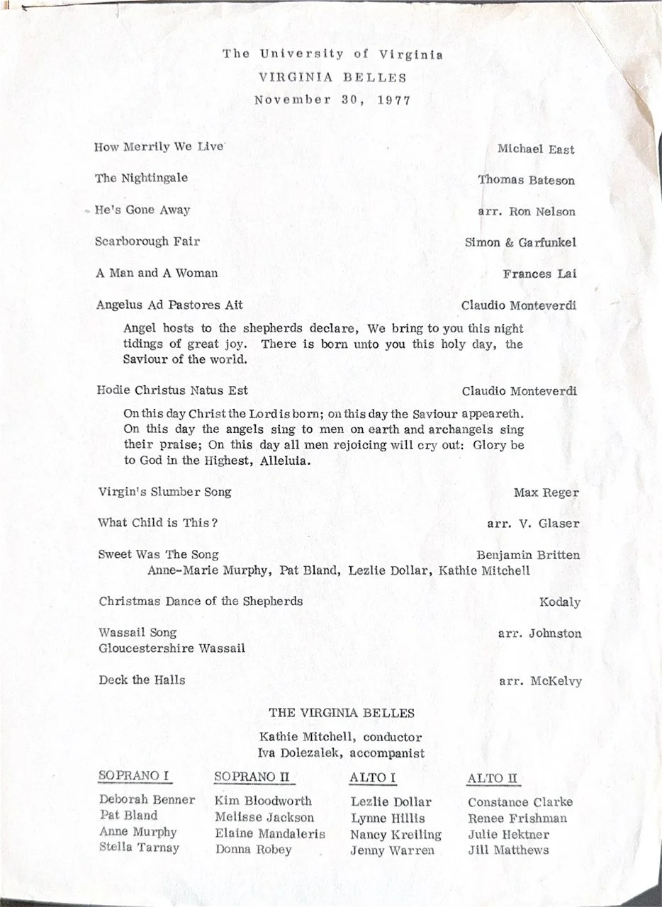 In 1977, UVA student Katherine Mitchell realized that there was no existing outlet for female a cappella at the University, despite the University’s first all-male a cappella group, the Virginia Gentlemen, founded in 1953. Unwilling to let the boys have all the fun, Katherine founded the Virginia Belles as the VG’s female counterpart, comprised of the most talented members of the Virginia Women’s Chorus. While the Belles are no longer a part of the Women’s Chorus, the group remains affiliated with the McIntire Department of Music at the University and continues to bring together exceptionally talented women with a passion for music.